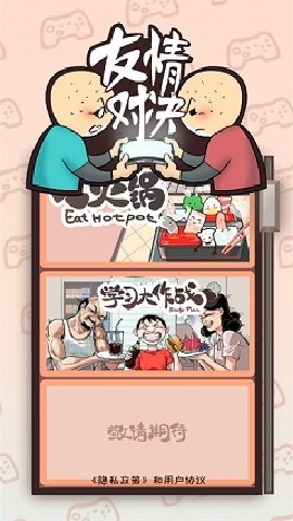 1、打开友情对决游戏,进入游戏主界面,可看到包括吃火锅、学习大作战和堕落街,玩家可自行选择体验,这里以【吃火锅】为例,