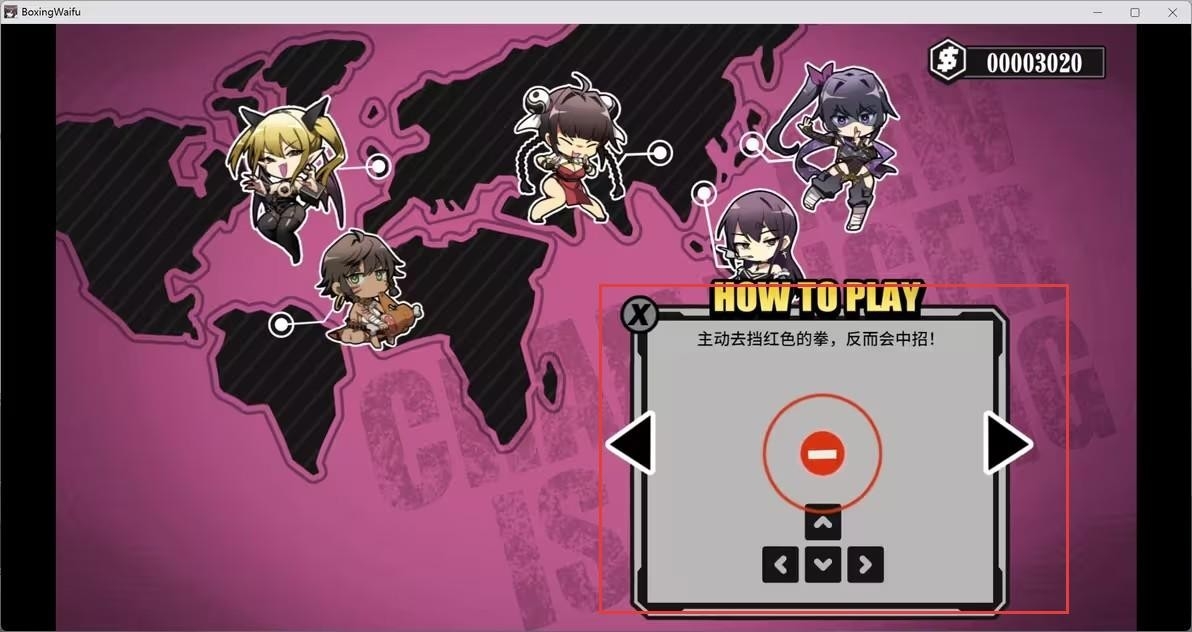 1、进入女拳主义手游的游戏地图,点击角色,触发HOW TO PLAY教学,学习红色拳应对,不主动格挡,规避中招风险。