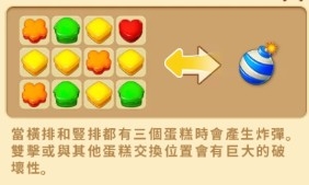 4、当横排和竖排都有三个蛋糕时会产生炸弹,双击或与其他蛋糕交换位置会有巨大的破坏性