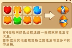3、当4个相同颜色蛋糕连城一条线就会昌盛冰淇淋,双击或与其他蛋糕交换位置能消除更多的不同蛋糕