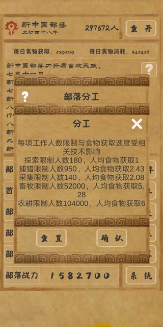 ①威胁进贡、驱逐老人:一头一尾,永恒之选②大量宣传:涉及到后面的娶妻,必选,这样可以娶两个(嘿嘿嘿)③不用训练、控制生育:暂时之选,节省开支④抓捕流民:本游戏前期发育的关键3、之后开始分工,采集-捕猎-探索,按顺序分配,满了才安排下一个。二、娶妻(太初十五年)1、每年收流民,安排生产,部民体质和战力稳步提升,名声跌到-100,不能再低,这一年开始前,可以把最弱的那个部落干掉。
