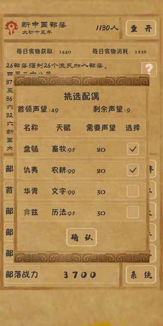 2、老婆来了,这里已经有49声望,娶前面两个绰绰有余,于是有人问了,其实如果完成成就,初始加5首领声望的话,其实可以选后面的一个。这里笔者要特别提醒,必须选择前面两个,否则无法解锁畜牧业和农耕,部落直接gg。而文字和历法这两个,作者还没开发,相当于没有天赋。