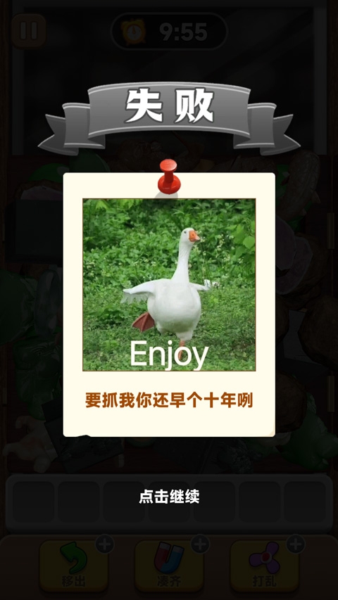 5、如果在规定时间没有成功消除所有物品,抓到大鹅则游戏失败;