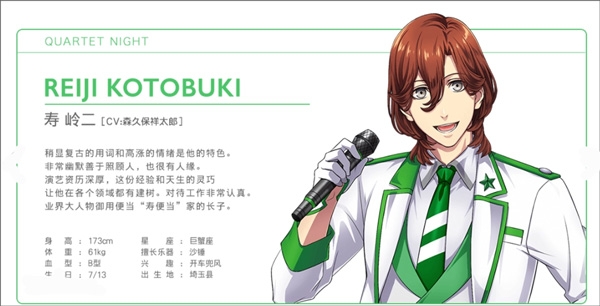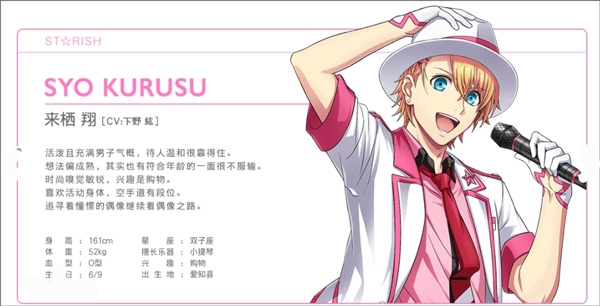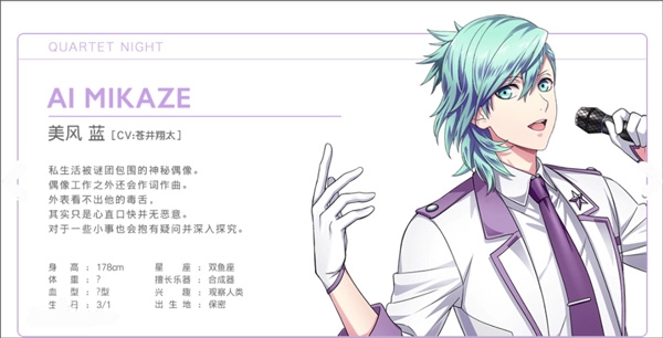 私生活被谜团包围的神秘偶像,偶像工作之外还会作词作曲。外表看不出他的毒舌,其实只是心直口快并无恶意,对于一些小事也抱有疑问并深入研究。