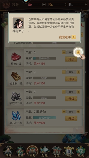 3、仓库中有从不倦怠的仙仆开采各类修真资源,有盈余的食物时可以进行仙仆招募。
