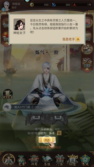 1、点击屏幕中间的修炼角色即会开始修炼,积攒真气。