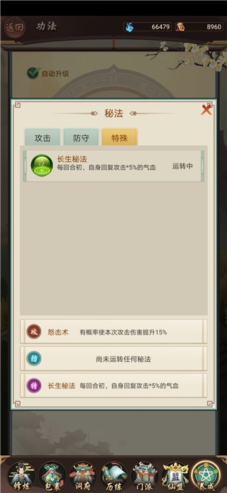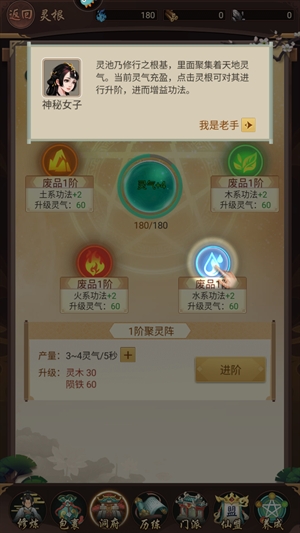 4、灵池乃修行之根基,里面聚集着天地灵气。当前灵气充盈,点击灵根可对其进行升阶,进而增益功法。