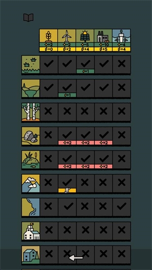 5、点击关卡最下方的书本按钮可以查看建筑在不同地块上的效果。