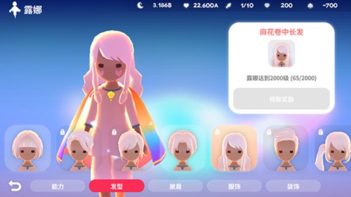 2、点击露娜,可以为她换发型、披肩、服饰等,还可以提升她的能力;