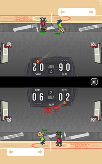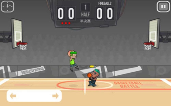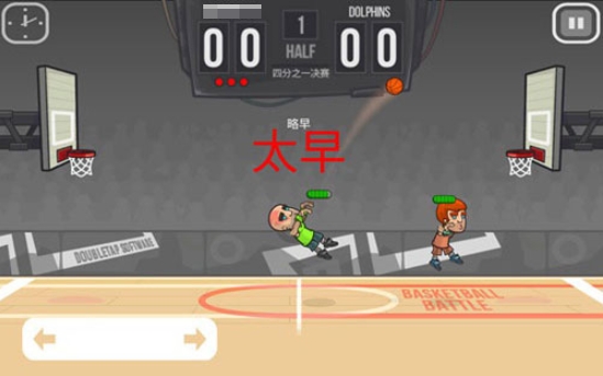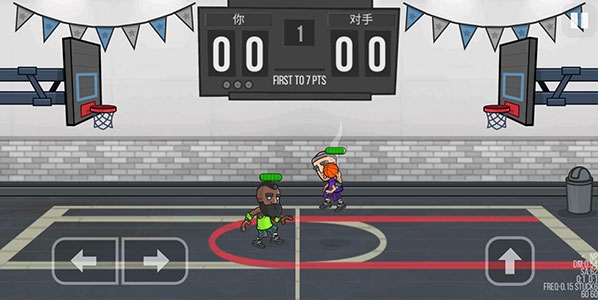 2、屏幕左下角的两个箭头可以控制角色移动,用手指按住屏幕右侧空白区域可以控制角色跳投。不过跳投的时候的注意一点,在主角跳到空中的时候就得放开手指,否者我们的角色是不会将篮球投出去的。