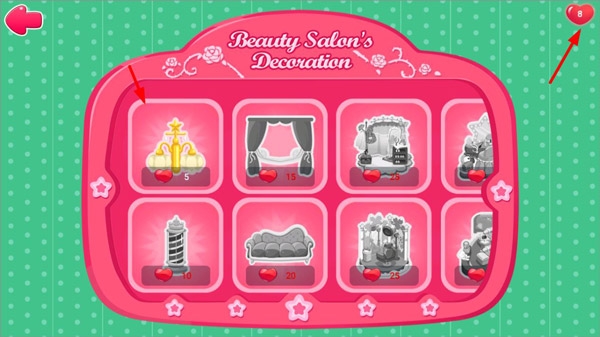 7、收集到足够的爱心,就可以去买漂亮的装饰来升级美容院啦;