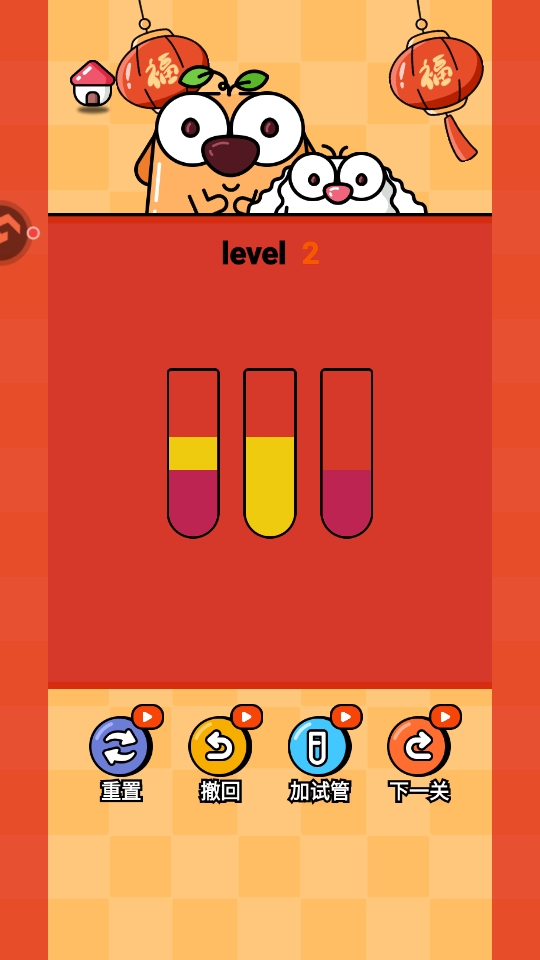 2、我们现在开始闯关;进入游戏后,我们需要把所有试管里的彩色液体,按颜色分层归类,让每个试管最终只装一种颜色就能成功通关