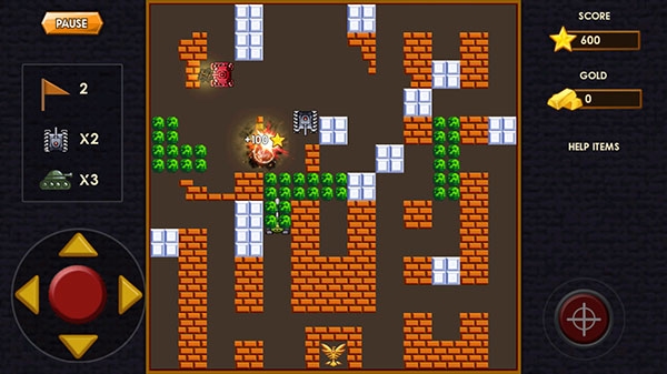 4、点击“PLAY”进入关卡,左下角可以上下左右控制己方坦克移动,右侧可以释放炮弹,左上角“PAUSE”还可以暂停游戏,在保护地形底部的司令部不被攻击的前提下再消灭敌方坦克,就可以过关。