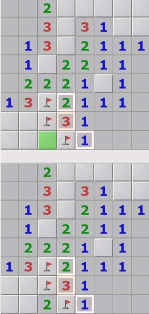 4、看下图,左边的2可以确定两个未打开的邻格是雷,右边的2共有五个没有打开的邻格,其中也包含这两个雷,因此可以确定剩余3个格子不是雷,可以点开。