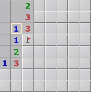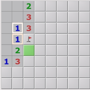 5、再看下图,数字3有四个邻格没有打开,这些格子中,通过上面的2可以确定两个雷,通过右下方的1可以确定1个雷,因此可以确定剩余的一个格子不是雷,可以点开。