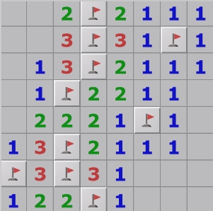 2、我们根据这些数字找出哪些格子是雷,哪些不是雷。点开所有无雷的格子,游戏胜利,如果点中雷,那么游戏就会失败。看下图的数字1,1代表它周围只有1个雷,而它的邻格当中仅有一个没有打开,因此可以确定这个格子是雷。