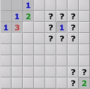 3、再看第二个数字1,它有两个邻格没有打开,而其中一个已经确定是雷,因此可以确定另一个是安全的,可以点开。
