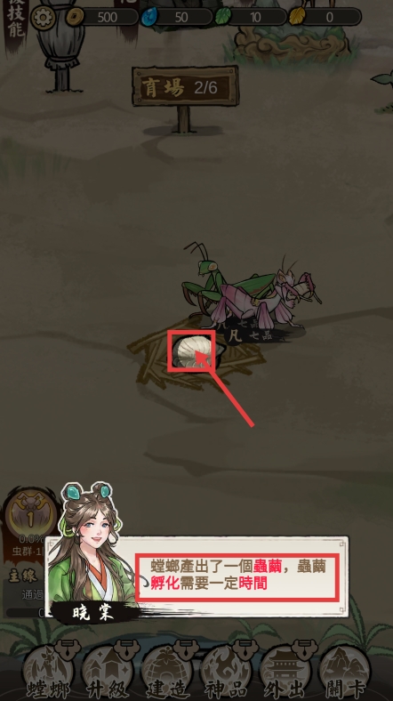 4、还可以将两只螳螂放在一起杂交繁育,点击【繁殖】,这样就可以获得高品级白龙螳了。