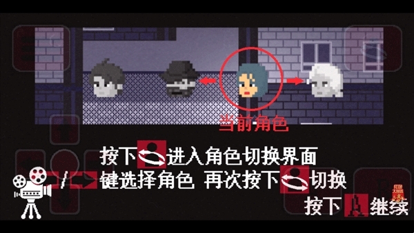 6、最后一项新手引导最重要:就是角色互换,主要有四种角色,每一个角色触发的剧本都不一样,要想知道游戏最终的真相,需要时不时地切换游戏角色,如果想切换角色,只要点击图片显示的角色切换按钮,然后按左右键选择你要切换的角色,选好后再按钮角色切换按钮即可切换成功。