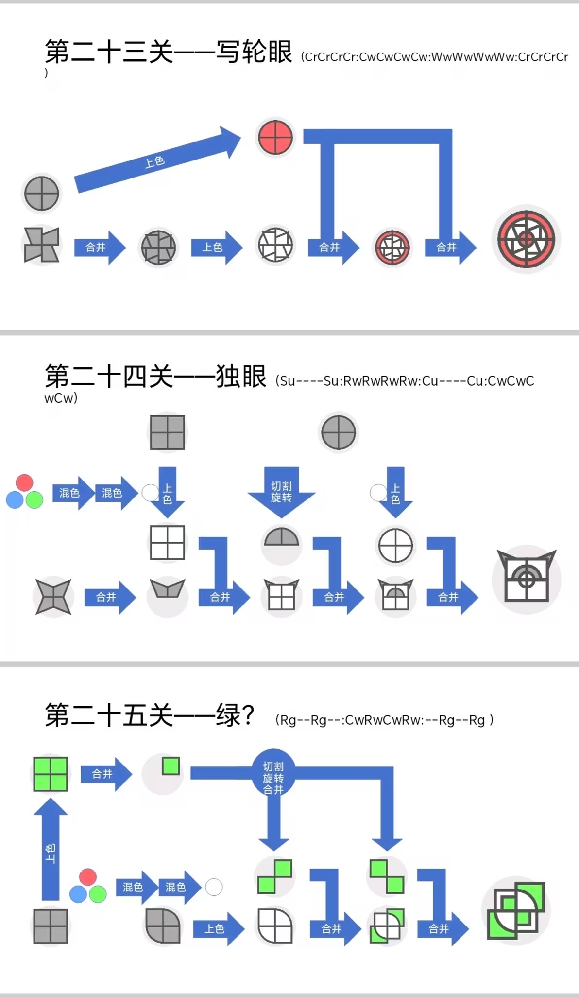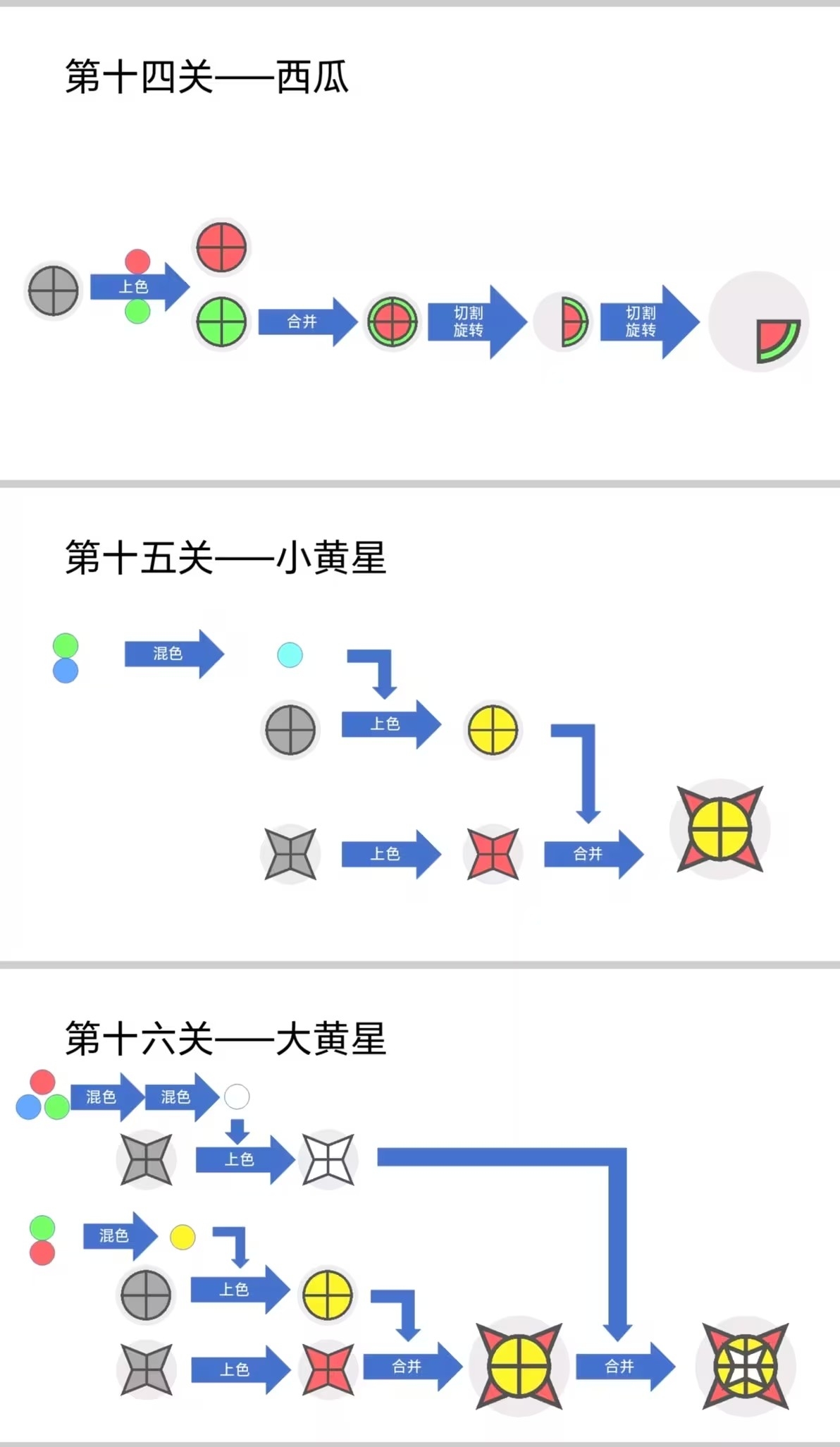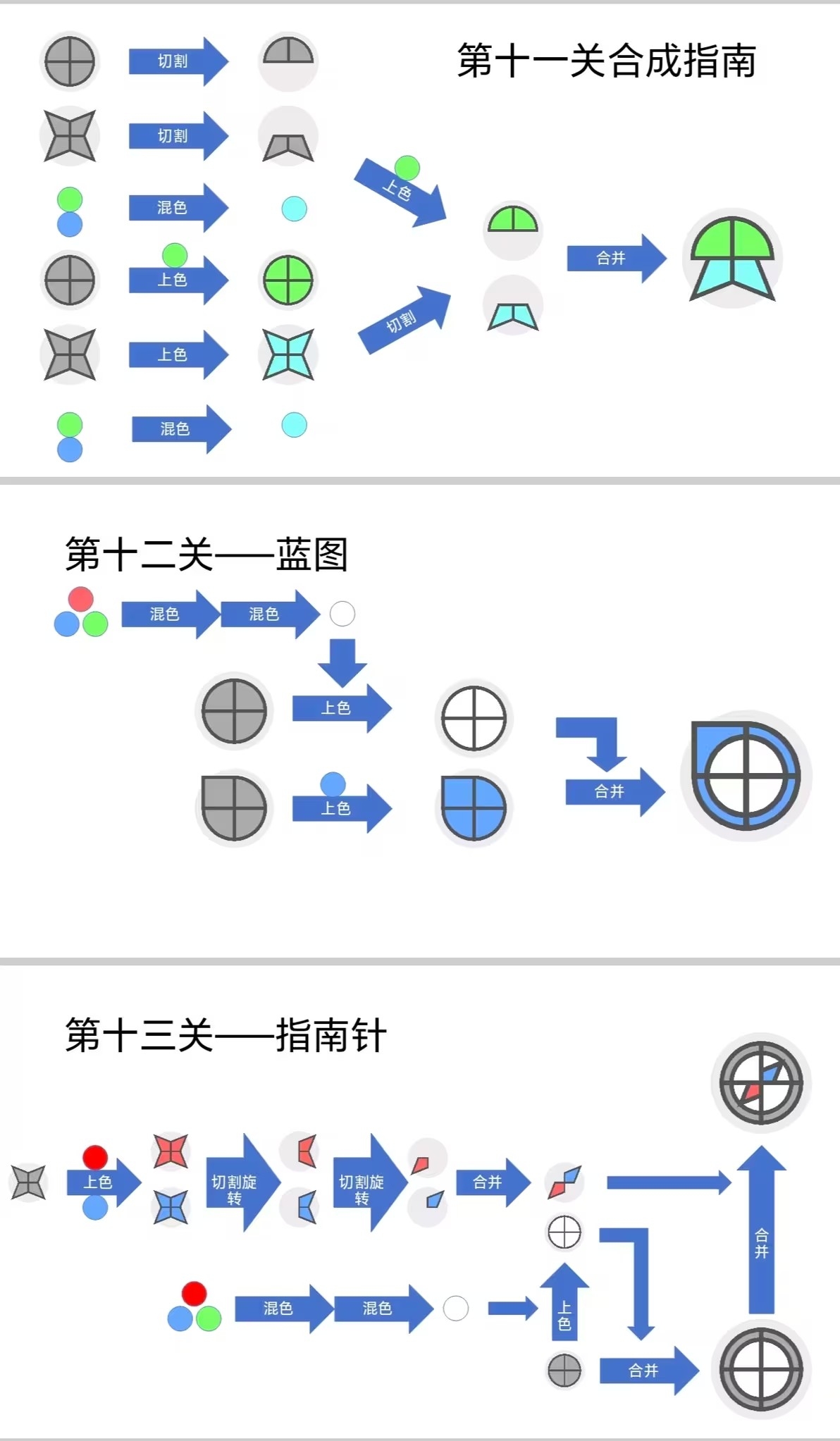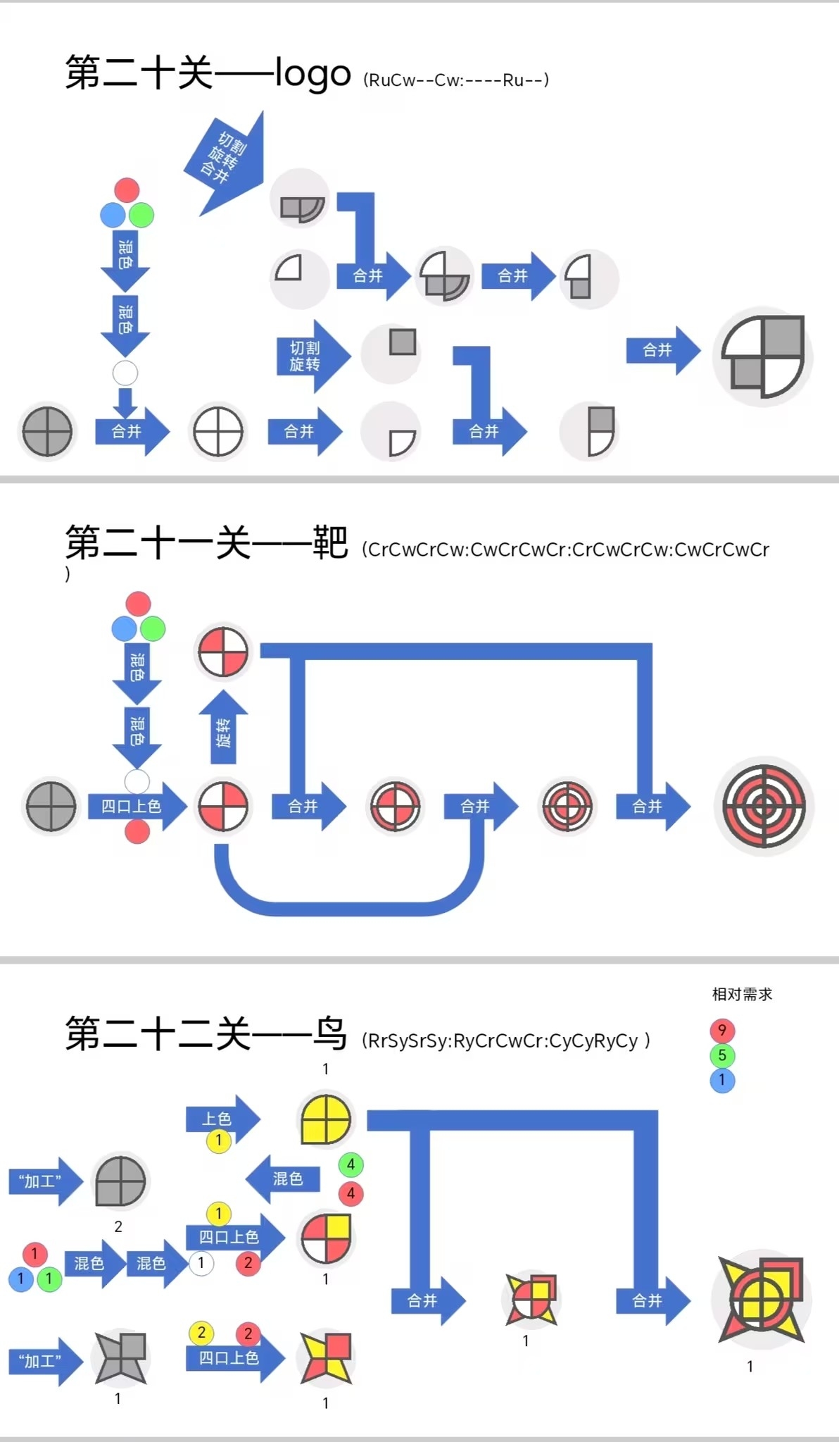 资源优化:比我第11关为例,我展示了两种合成方法,区别在于资源的使用量和工序的复杂度,特别是颜料资源。之后的通关流程大多都会按照资源最少的标准去表示。