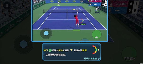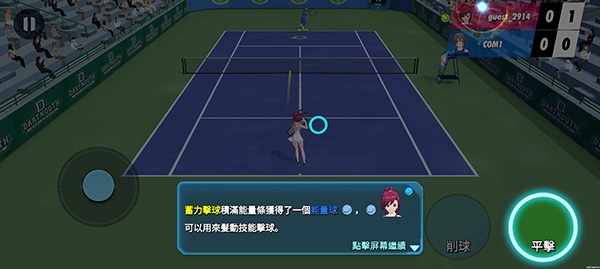 4、当出现削球安按钮时就可以按下平击按钮蓄力,当力满时松开,能击出最大速度的网球