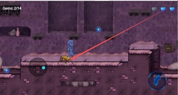 1、滑动虚拟摇杆控制角色移动,点击右侧的按钮可以实现跳跃。