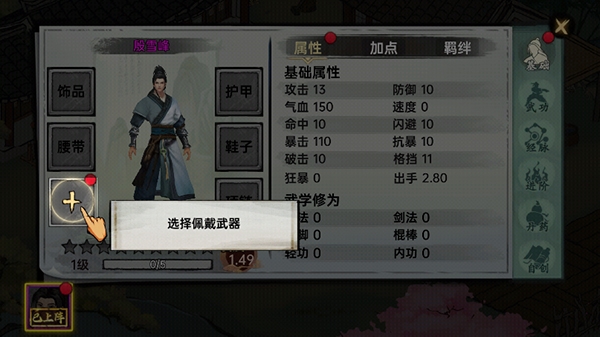 5、玩家还可以在角色界面进行武器装备的穿戴,然后就可以开启自己的江湖之旅啦!