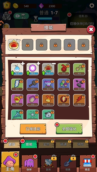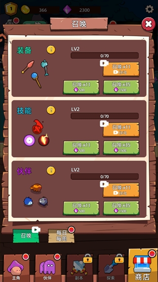 2、当感觉打不过的时候,点击商城去召唤【装备、技能、快伴】