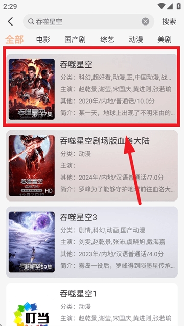 1、在本站下载安装并打开叮当影视app,进入首页后可以推荐板块查看热门电影电视剧,也可以直接顶部搜索框搜索想看的电视电影