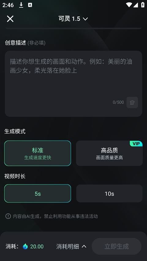 2、输入描述,支持中英输入,字数限制在500字以内,如果暂时没有灵感可以随机生成。提示词最好说明具体的要求,丰富且清晰。公式:主体+行为、特征、情景、情感+时间+环境+动作行为+质感、构图、色调、细节。