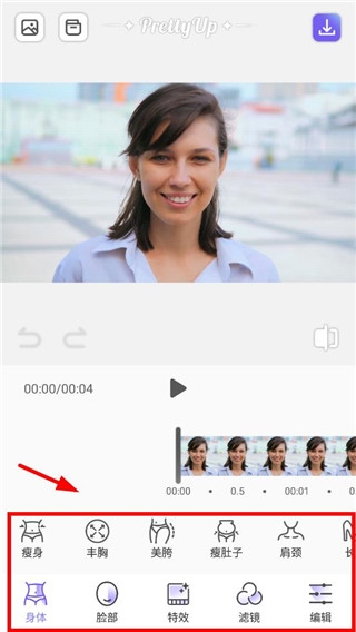 3、在这里不仅可以很轻松的美化视频,还可以美化面部,连身材都是可以直接美化的。