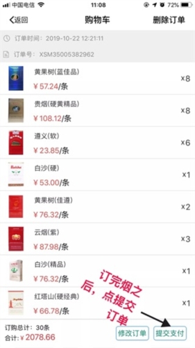 4、用户订购的卷烟均保存在购物车中,确认无误后,再点击提交。