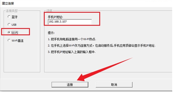 开womic电脑版,点击连接,选择你要连接的方式,wifi的方式,需要填写刚刚记录下来的ip地址,蓝牙的方式需要先将手机通过蓝牙方式连接到电脑;