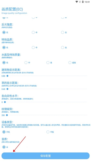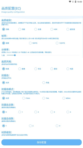 2、在画质配置界面,选择你想要的画质级别、帧率、分辨率和画质风格等各种选项!