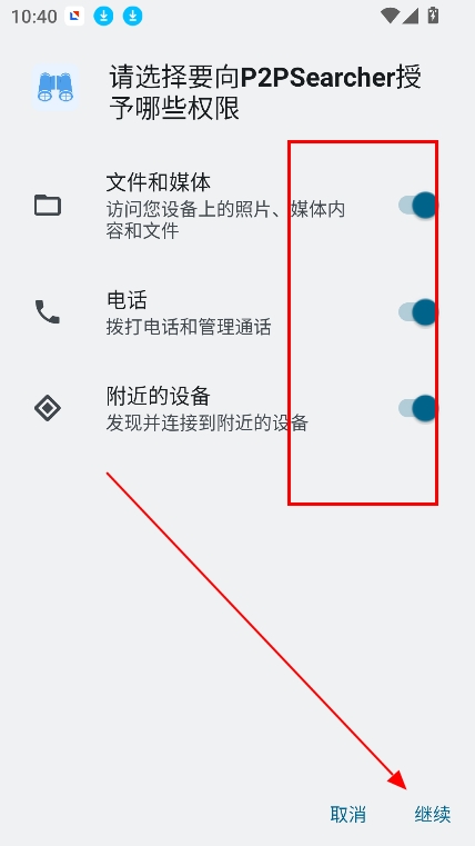 在本站下载安装P2PSearcher安卓版,进入勾选授权,点击继续