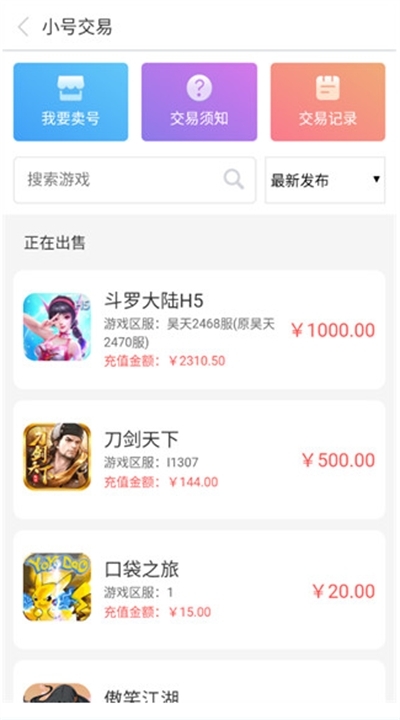4、交易界面是交易游戏账号的地方,如果你不想玩了可以在此进行交易。