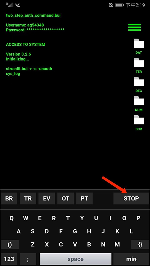 3、可看到代码编辑界面会自动输入并且滚动代码,我们点击【STOP】选项,即可暂停自动输入,