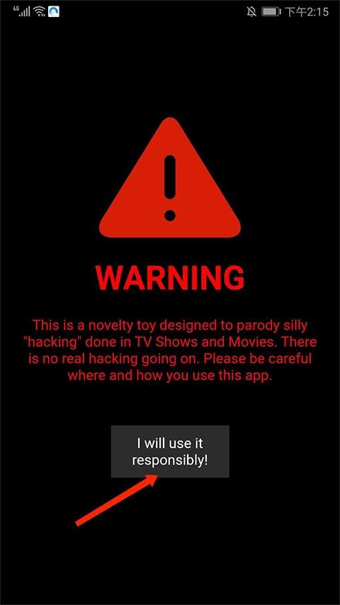 1、打开geektyper,进入应用主界面就有一种黑客的感觉了,点击下方【I will use responsiblly】提示,