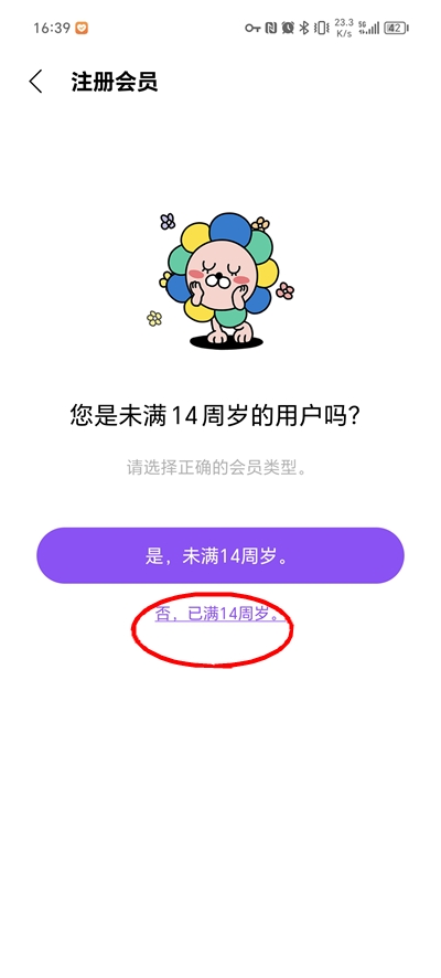 然后你需要选择是否满14周岁,未满14周岁需要使用监护人信息进行注册,这里展示满14周岁的教程
