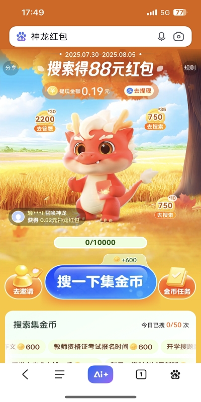 3、能量收集机制:通过参与活动积累神龙能量,当能量达到要求后即可召唤红包,增加了活动的趣味性和挑战性。