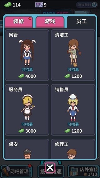 3、雇佣与管理员工:雇佣员工并管理他们,确保网吧的日常运营顺畅,处理各种大小事务。