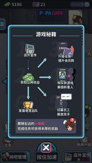 1、经营濒临破产的网吧:玩家接手一家濒临破产的网吧,通过一系列经营策略将其转变为时尚奢华的网咖。