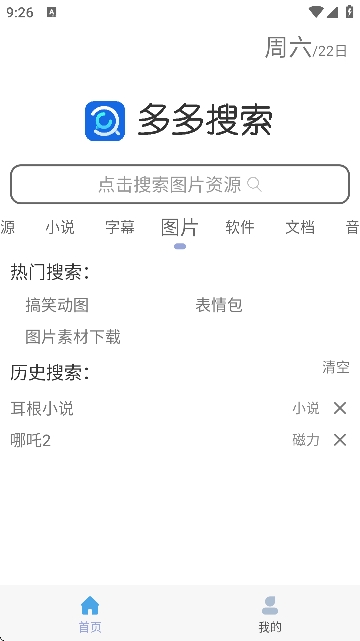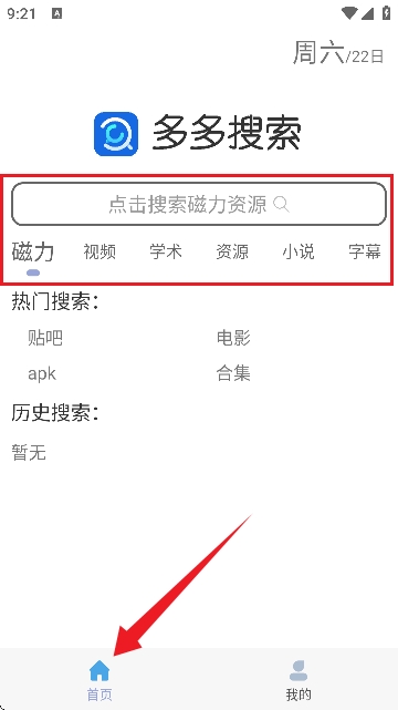 3、进入到软件首页,如图所示。这里支持磁力,视频,学术,资源,小说,字幕等内容的搜索。
