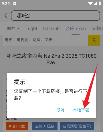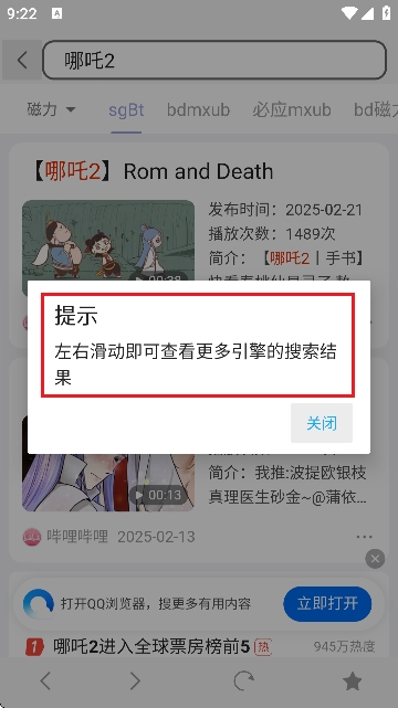 4、例如搜索“哪吒2”,随即就能给出搜索结果,并且会给出一个提示框,如图所示,【左右滑动即可查看更多引擎的搜索结果】