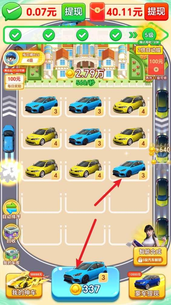 2、合成出的豪车为指定的等级还会有额外福利,可以直接获得提现到微信的红包奖励!