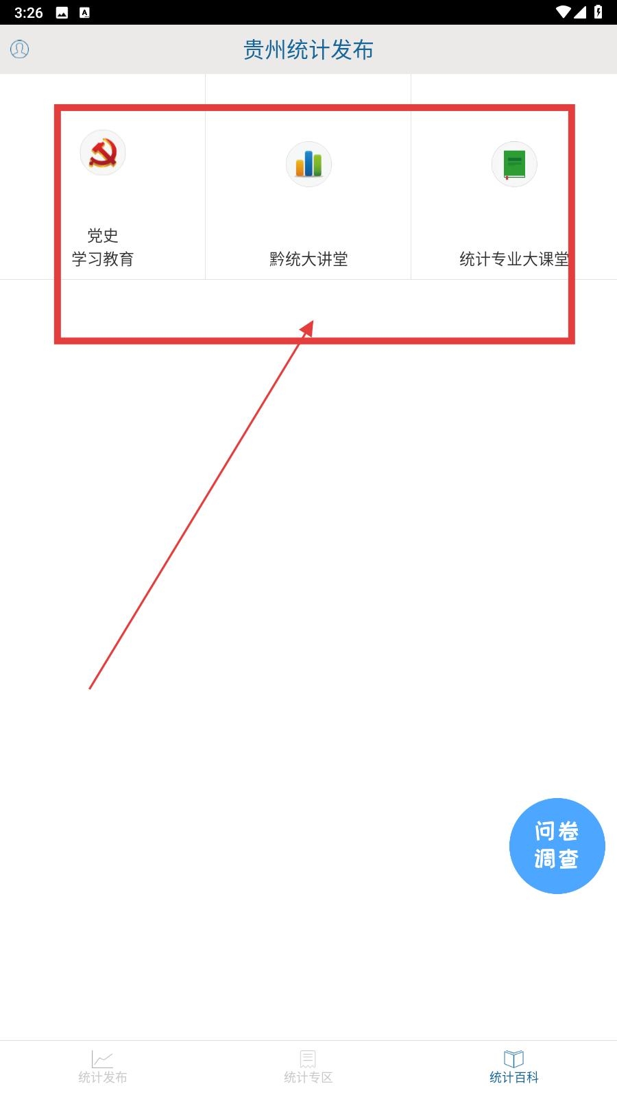 2、统计百科板块含党史学习教育、黔统大讲堂等内容,提供知识学习、专业课堂入口,助力提升认知。