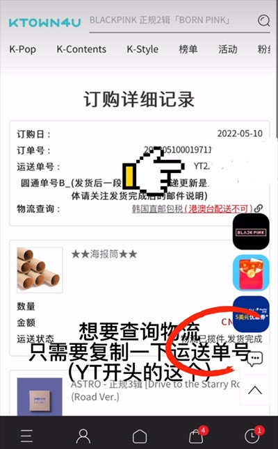 6、复制好订单的物流单号,打开微信公众号搜索,“天泽航物流”点击左下角的查询物流,输入k4town的运送单号就可以查到具体配送情况了!