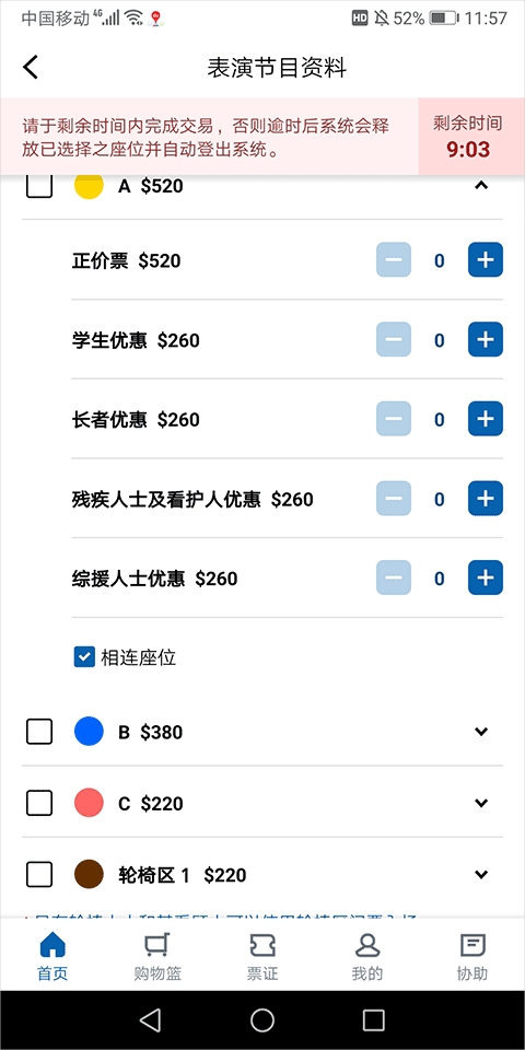 9、选择座位,有颜色的代表可以选择,灰色的代表已选择完了
