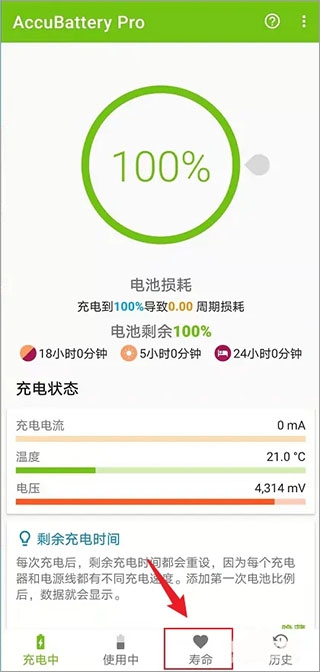 3、等待手机充电到100%后,点击底部菜单中的【寿命】;