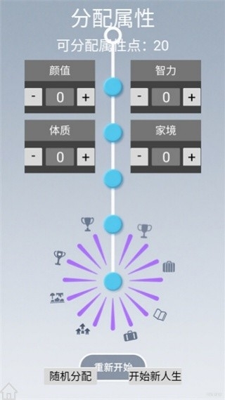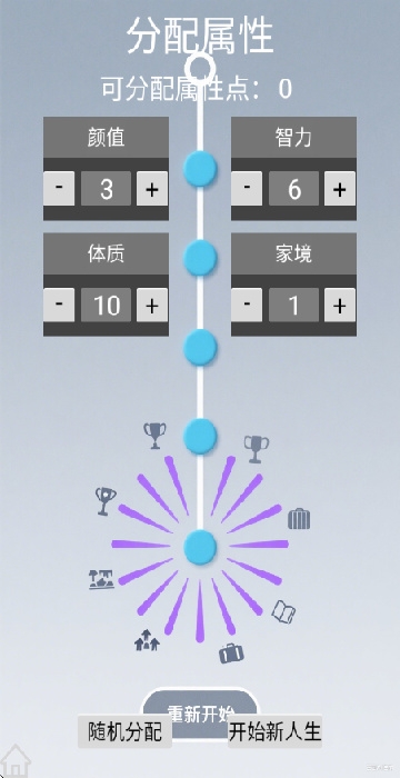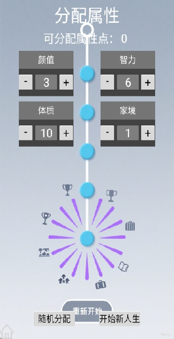 3.进入分配属性时,你可以根据需求对颜值、智力、体质、家境做分配